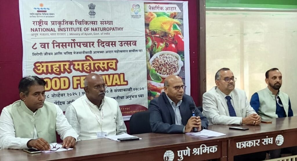 Spread the love Governor Acharya Devvrat and Union Ayush Minister Prataprao Jadhav to attend valedictory event Pune: To promote the philosophy and scientific approach of naturopathy, the National Institute of Naturopathy (NIN) will organise a three-day Natural Food Fair from November 16 to 18 at the Nisarg Gram campus in Yeolewadi. The event is part of the observance of the 8th Naturopathy Day, NIN’s acting director Amarendra Singh announced at a press conference. Present on the occasion were Dr Satyenath, Omprakash Shukla, Mandar Deshpande, and Saurabh Sakalye. Singh stated that the festival will remain open to the public from 10 am to 5 pm daily. The Prime Minister Narendra Modi has underscored the national priority of obesity prevention through a balanced diet and physical activity, including reducing intake of edible oils. This year’s theme is centred on “Losing Weight Naturally through Naturopathy.” The event will highlight oil-free, plant-based dietary practices through demonstrations, educational exhibits, and stalls offering healthy food options. As part of the festival, an intercollegiate meet for students of naturopathy and yoga sciences has been planned. Competitions will include a medical quiz, elocution and essay contests, research paper presentations, physiotherapy demonstrations, reel competitions, fire-free cooking, fruit-and-vegetable carving, and an Idea Hackathon. For teachers, a Faculty Development Programme, along with specialised workshops on osteopathy and chiropractic techniques, has also been scheduled. The valedictory ceremony will be held on Tuesday, November 18, at 4 pm, with Governor Acharya Devvrat and Union Ayush Minister Prataprao Jadhav attending as chief guests. Higher and Technical Education Minister Chandrakant Patil and Chief Postmaster General Amitabh Singh will also be present. The concluding event will feature the release of a special postal stamp dedicated to the National Institute of Naturopathy, the unveiling of publications and the announcement of competition winners. Awards will also be presented to Dr Dinshaw K. Mehta (Outstanding Expert) and Dr S. N. Moorthy (Outstanding PG Student), Singh added. Post Views: 9 Post navigation Connecting Trust to Host 3-Day International Conference on Suicide Prevention in Pune from Nov 28–30 Builders’ Association of India (BAI) to Organize the 29th ‘Well Built Structure Competition’